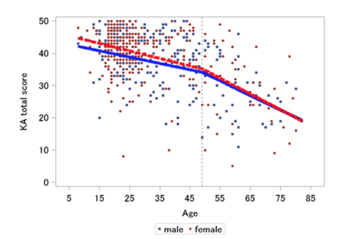 簡単に研究結果を話すと、運動能力は性別にかかわらず、加齢に伴って低下し、49.1歳を境に急激に低下することが明らかとなりました。