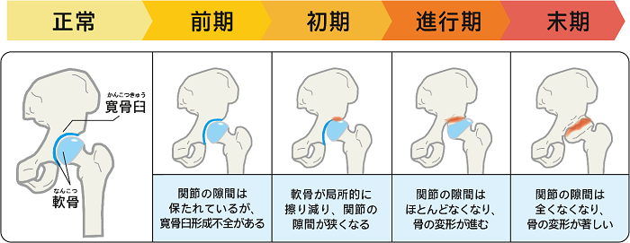 変形性股関節症は、姿勢や動作のクセによって股関節の軟骨がすり減ることで関節が変形し、痛みや可動域の制限が出る病気です。特に40〜50代以降の女性に多く、先天的に股関節の形が浅い「臼蓋形成不全(きゅうがいけいせいふぜん)」をもつ方が発症しやすいといわれています。